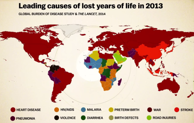 GBDが注目したのは「失った人生」の長さばかりではない。早死の原因も分析した。その結果がこれ。(画像はすべてVox「The #1 reason people die early, in each country」から)