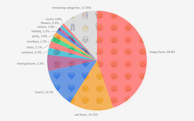 ナンバーワンは「スマイリー」。世界中で使用された絵文字の44.8%がスマイリーなのだ。次いで、「悲しい顔」(14.33%)、「ハート」(12.5%)、「手のジェスチャー」(5.3%)。